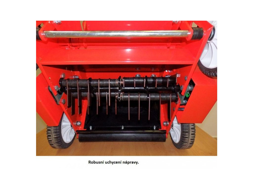 Motorový prevzdušňovač trávnikov WEIBANG 384 RC s motorom Loncin 5.0 HP, šírka pracovného záberu je 380 mm, plynulé centrálne nastavením výšky, robustné šasi z vysokoakostnej ocele, zberný kôš s objemom 40l. Hriadeľ je osadená 22 profesionálnymi flexi nožmi - táto konštrukcia eliminuje možné poškodenie nožov alebo celé hriadeľa. Hriadeľ je uložená v masívnych ložiskách. Hmotnosť prevzdušňovače je 46 kg.
